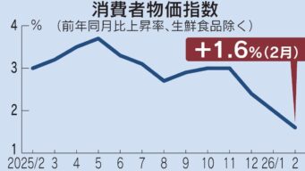 ニュー速+ 【消費者物価指数】2月1.6%上昇 伸び率3年11カ月ぶりに2%下回る