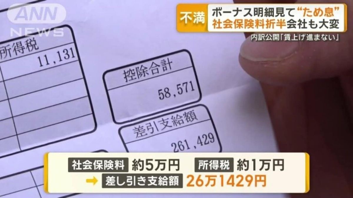 「(ボーナス)もらいました。1.5カ月分の給料くらいですね」この男性のボーナスは32万円。しかし、明細を見せてもらうと、社会保険料がおよそ5万円、所得税がおよそ1万円。総支給額から6万円ほどが引かれ、振り込まれているのは26万円余りです。