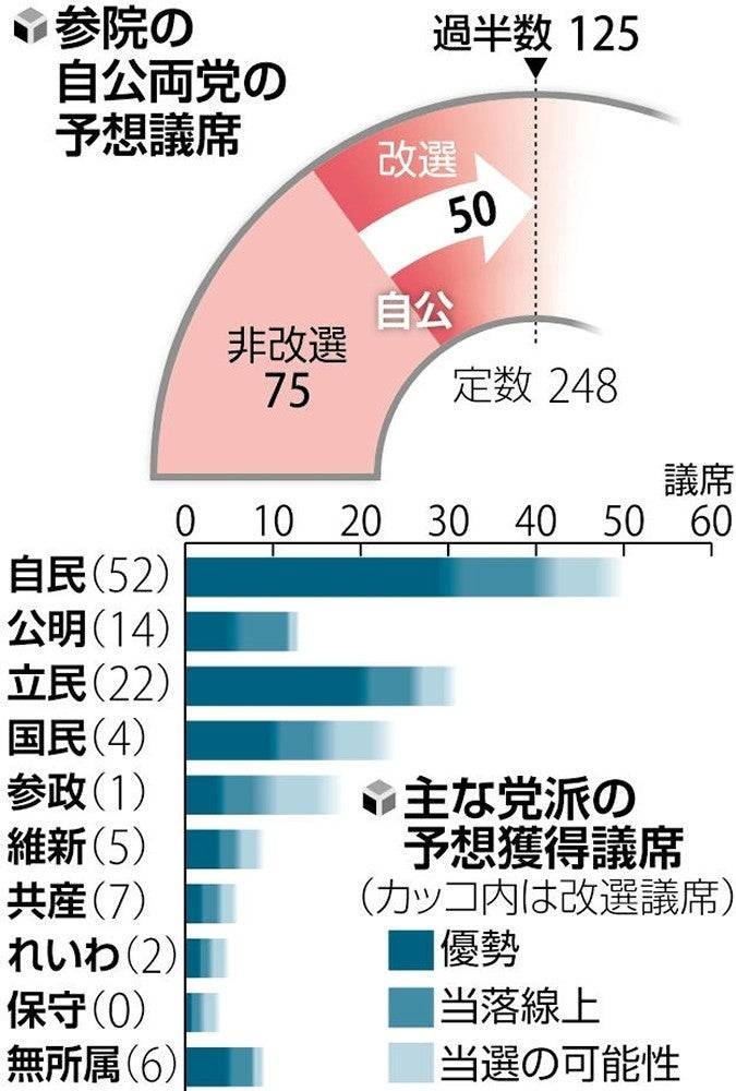 - 自公合わせて50議席が参院過半数ラインだから、49議席以下にならない限りほとんど意味はない。