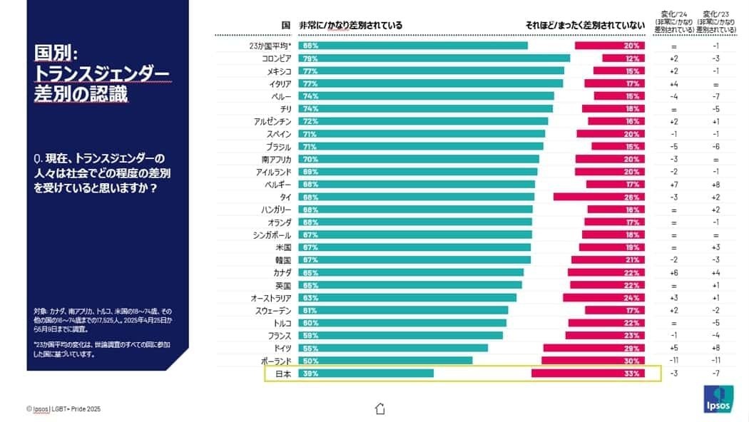 - 世論調査会社「イプソス」(本社パリ)が13日に公表したLGBT+(性的少数者)に関する26カ国調査で、心と体の性が異なるトランスジェンダーの人々について「それほど/まったく差別されていない」と回答した割合は、日本は33%だった。ポーランドの30%を上回る最も高い数値で、「非常に/かなり差別されている」の割合も25位のポーランドの50%に比べ39%だった。