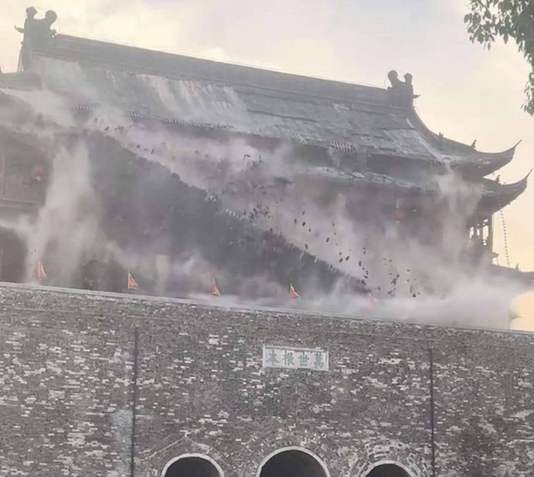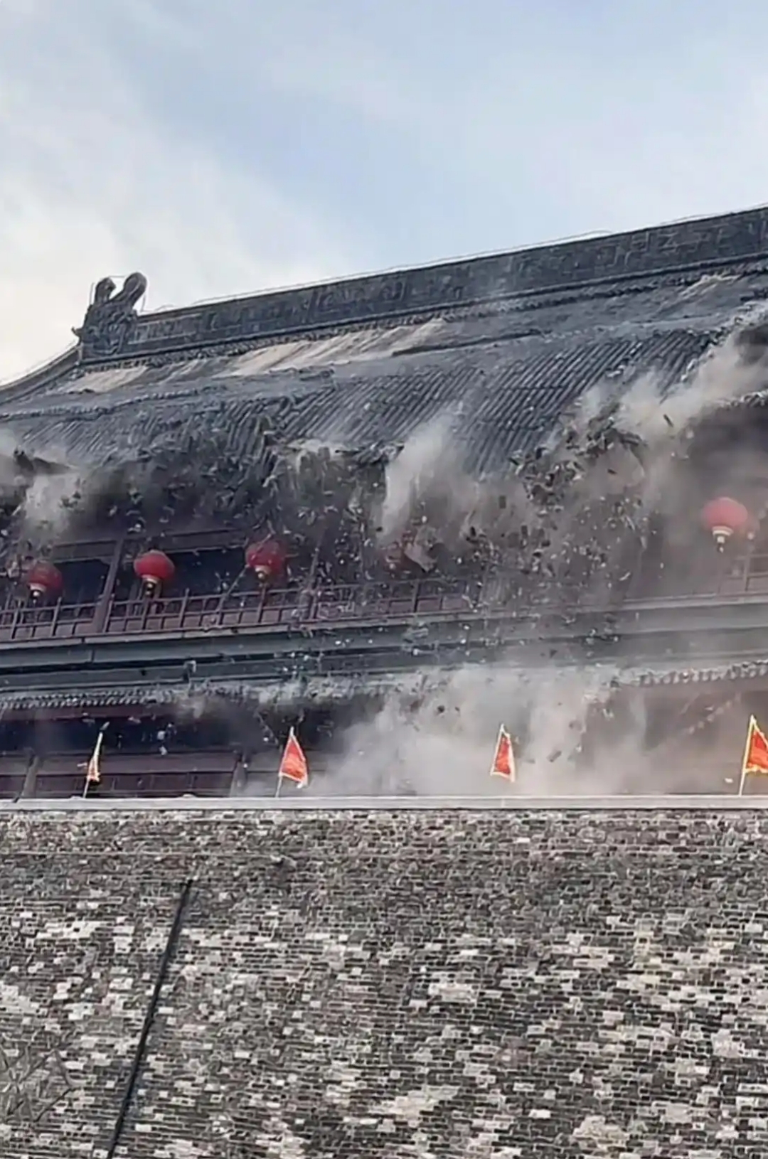 2025年05月19日18:30頃、中国安徽省鳳陽県にある「明中都鼓楼」の瓦屋根が次々と、まるで滝のように落下して崩壊する事故が