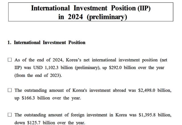 2025年02月27日に『韓国銀行』が2024年の「International Investment Position」(対外資産負債残高:略称「IIP」)を公表しました。