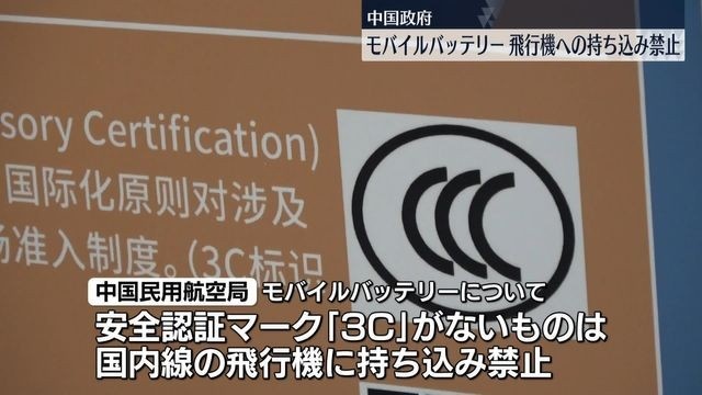 スマホなどを外出先で充電するモバイルバッテリーについて中国民用航空局は、28日から中国政府の安全認証マーク「3C」がないものは国内線の飛行機に持ち込みを禁止すると発表しました。
