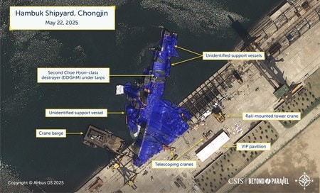 22日、北朝鮮北東部・咸鏡北道の清津にある造船所で横倒しとなった5000トン級駆逐艦(CSIS/Beyond Parallel/Airbus DS 2025提供・時事)【ワシントン時事】米シンクタンクの戦略国際問題研究所(CSIS)は22日、北朝鮮が新たに建造した駆逐艦の進水式で起きた事故を巡り、造船所で横倒しになった駆逐艦を撮影した衛星写真を公開した。写真は22日に撮影された。艦首が陸上に残ったまま艦尾部分が海側に投げ出された様子が捉えられている。