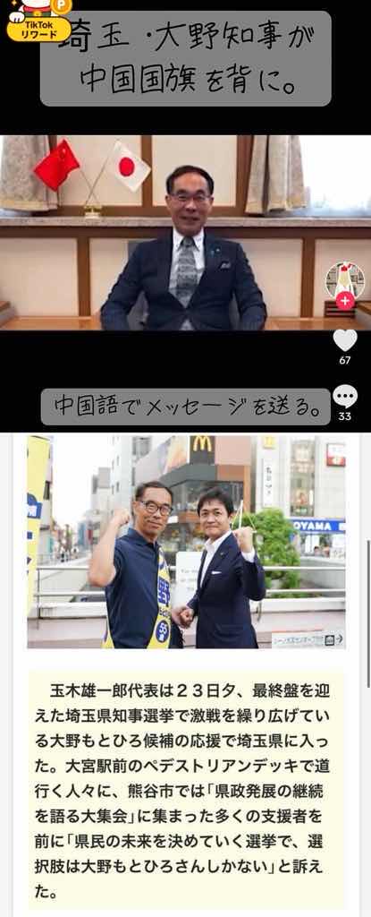 国民民主 埼玉県知事 大野元裕 中国国旗を背に 中国語でメッセージを送る(動画あり)