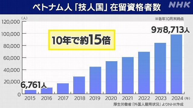 急増する”技人国” ベトナム人労働者 10年で約15倍に