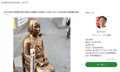 鈴木は当時、現場で撮った動画を自身のブログに掲載し、「日本大使館前に『追軍』売春婦像を設置した事実に日本人が激怒していることを世界に知らせ、韓国の嘘を暴露し、日本の名誉を回復すべきだ」などと主張した。