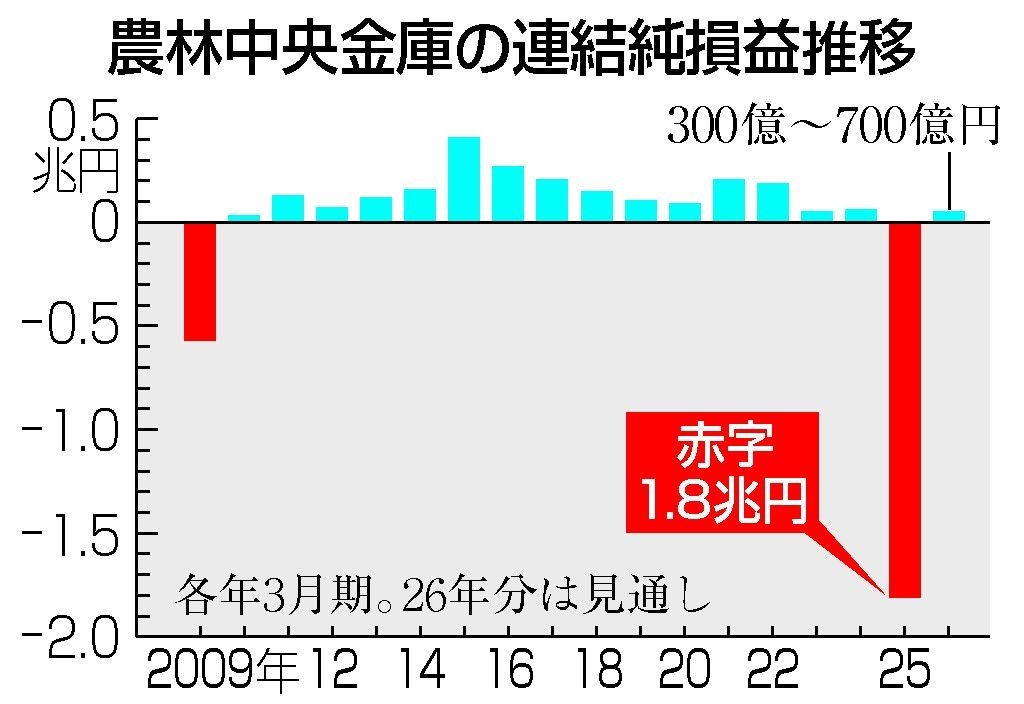 農林中央金庫は22日、2025年3月期連結純損益が1兆8078億円の赤字となったと発表した。外国債券の運用失敗で巨額損失を計上したことが主因。赤字幅はリーマン・ショックで金融市場が混乱した09年3月期(5721億円)を上回り、過去最大となった。