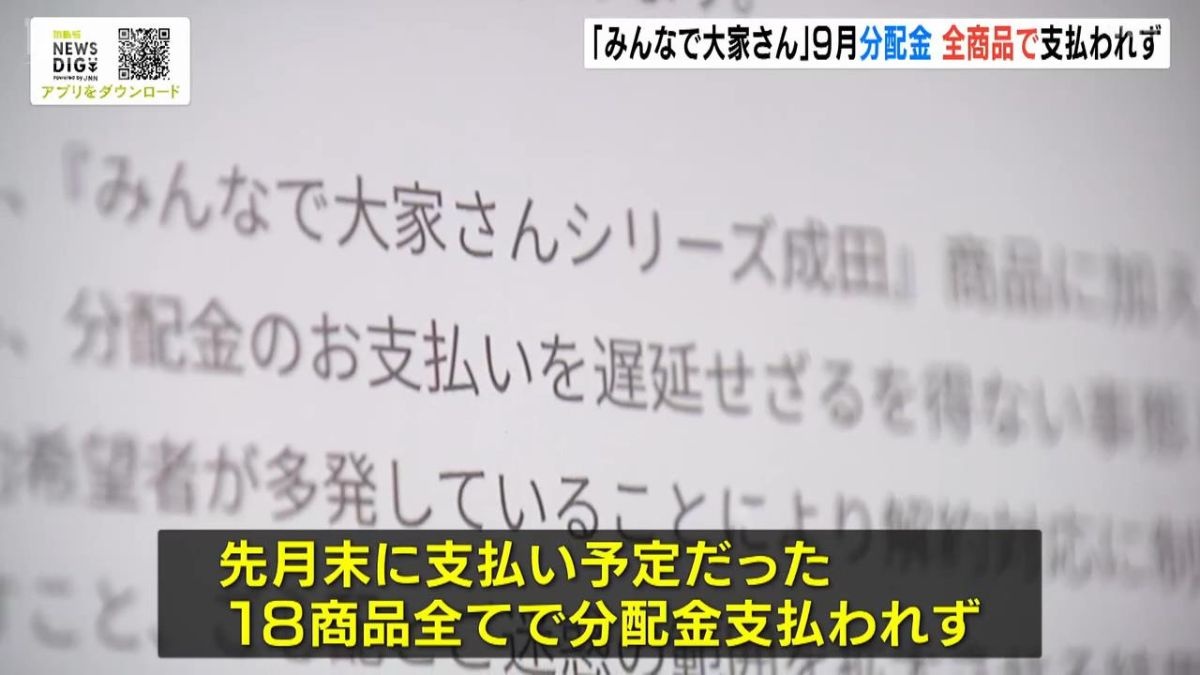 「みんなで大家さん」をめぐっては、千葉県の成田空港近くの土地開発に絡む投資商品に対して支払われる予定の出資者への分配金が今年7月から3か月連続で支払われていませんが、関係者によりますと、9月末に支払い予定だった18の商品全てで支払われていないということです。