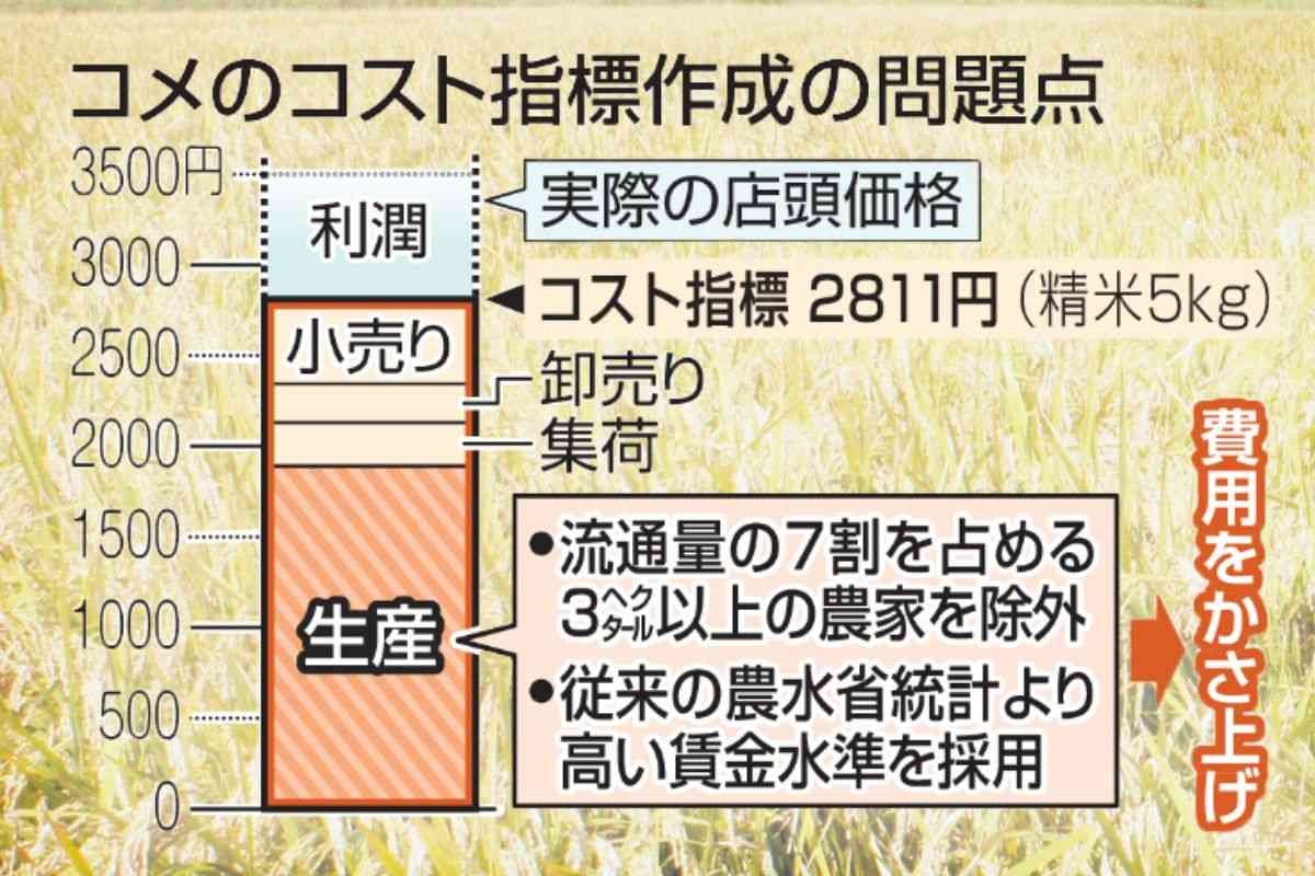 米価の目安として、農林水産省が4月に導入する「コメのコスト指標」の算出で、全国農業協同組合連合会(JA全農)などの要望で生産費が安い大規模農家のデータが除外された。その結果、コスト指標はかさ上げされ、米価の上昇につながる恐れがある。(鈴木太郎)