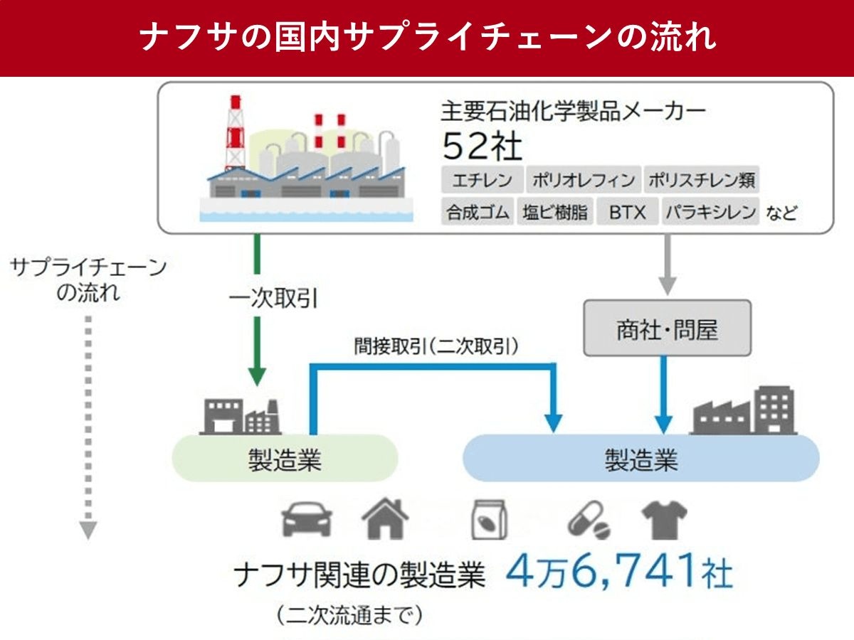 「ナフサ」不足、主要頂点の石油化学製品メーカー52社、サプライチェーン4万6741社で 電気・自動車・住宅・衣料・医療・食品