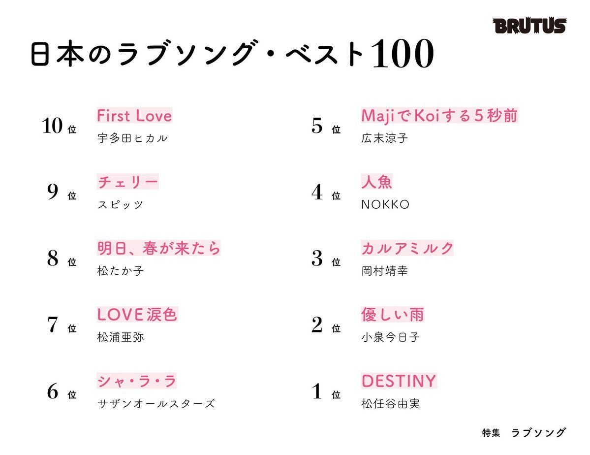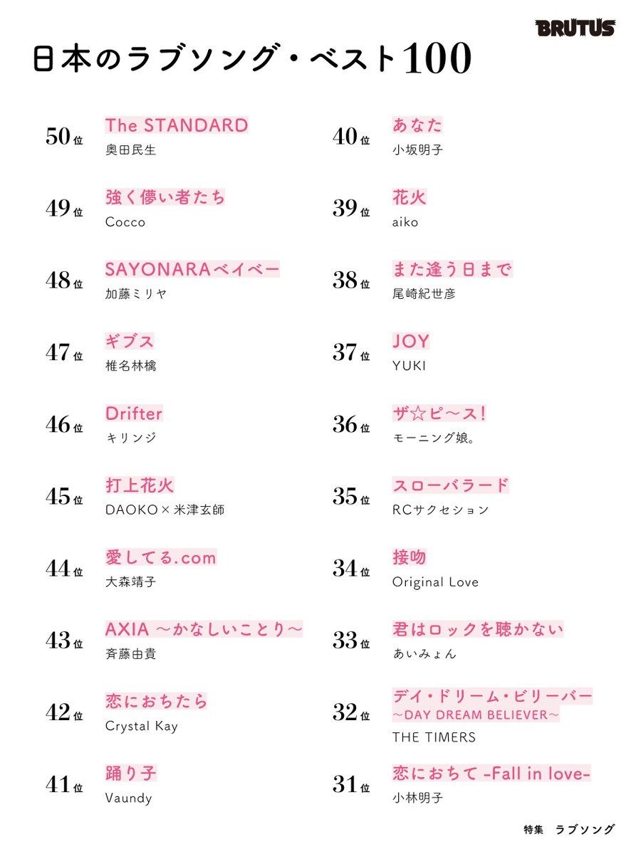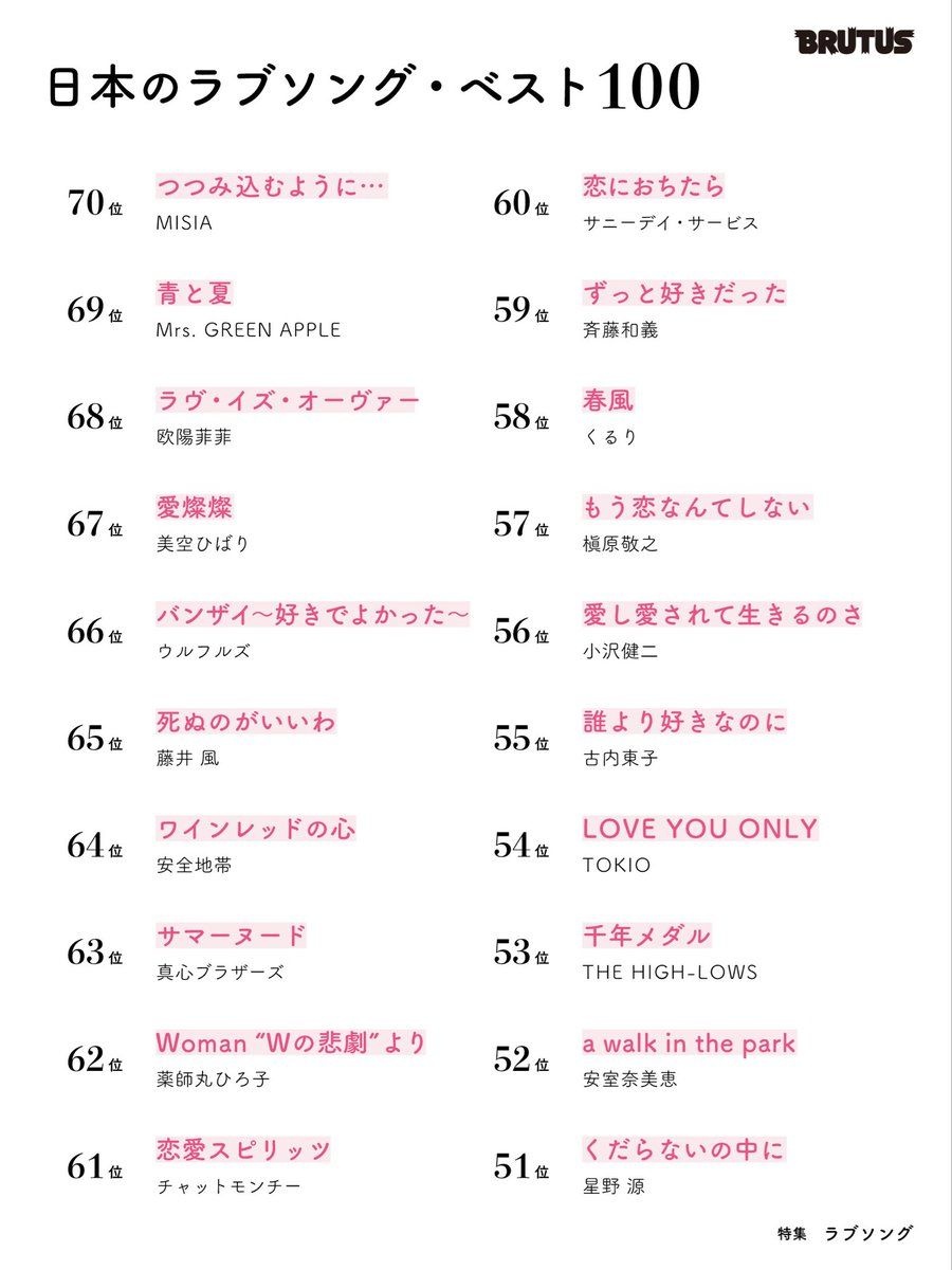 数ある日本のラブソングの名曲から、2025年現在の視点でスタンダードを決定。音楽を知り尽くした最高の聴き手たちによる大審査会で、今こそ聴きたい100曲を厳選します。#BRUTUSラブソング100 (※51位以下は省略。)