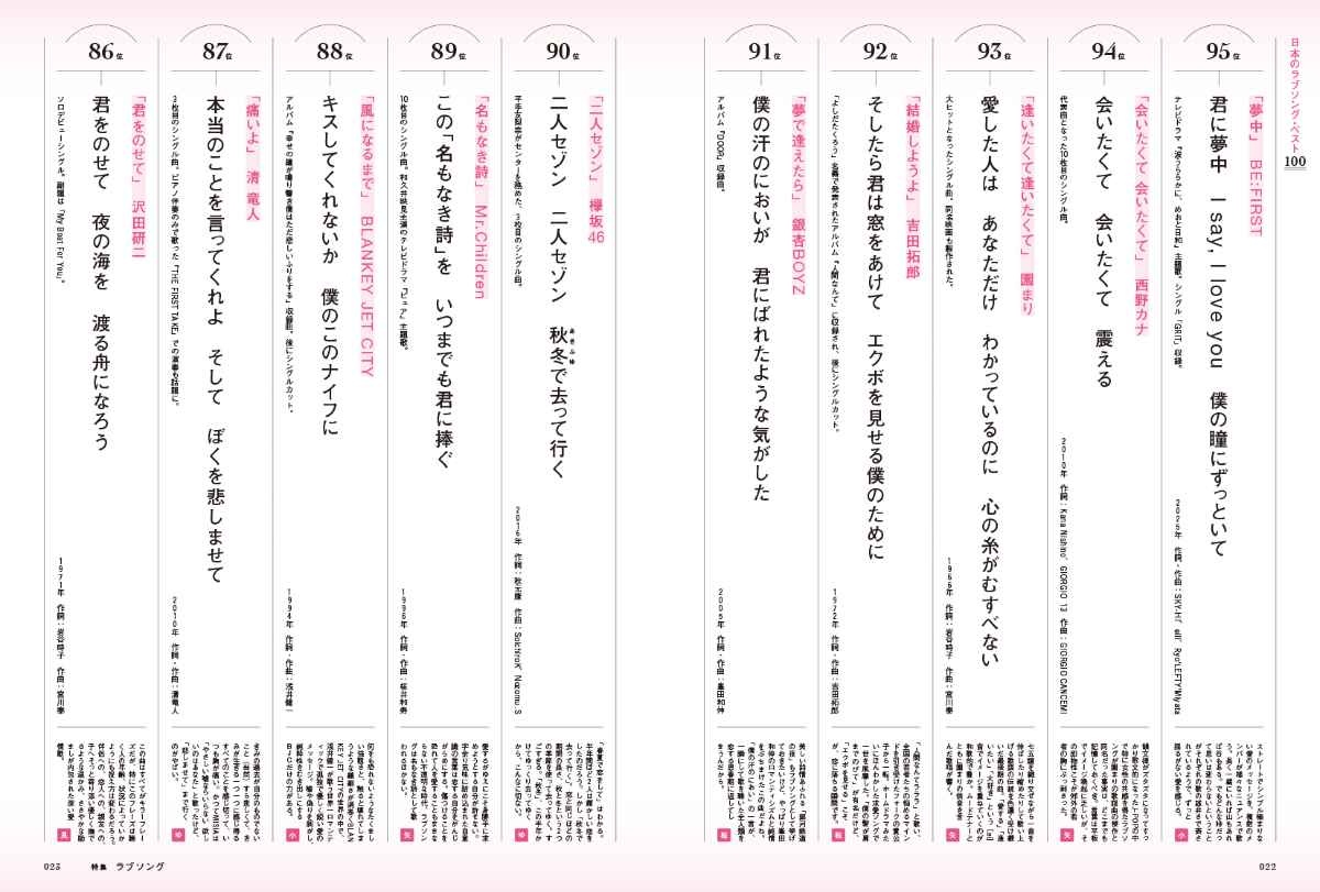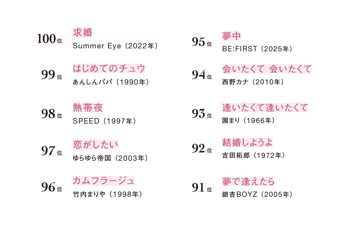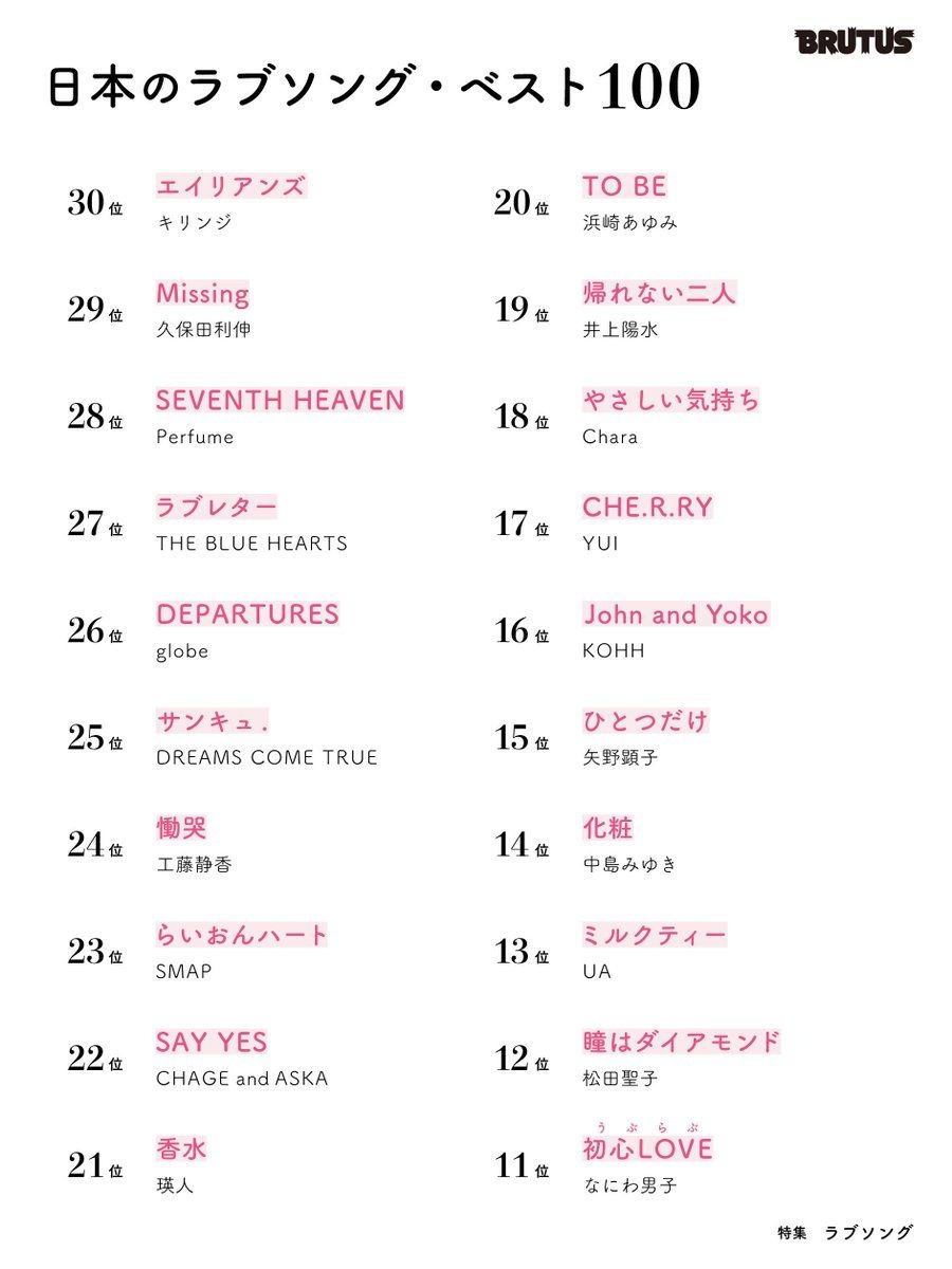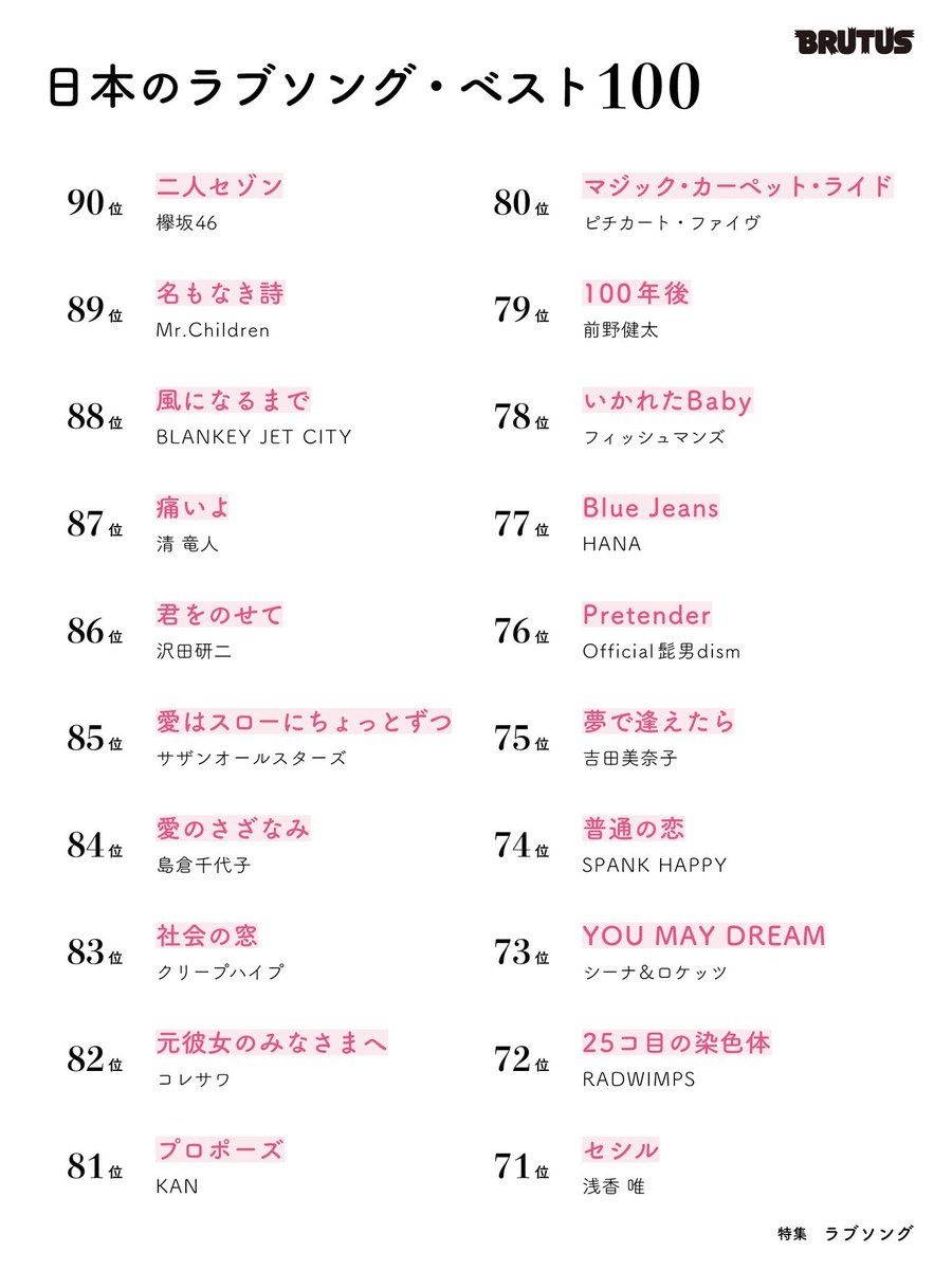 数ある日本のラブソングの名曲から、2025年現在の視点でスタンダードを決定。音楽を知り尽くした最高の聴き手たちによる大審査会で、今こそ聴きたい100曲を厳選します。#BRUTUSラブソング100 (※51位以下は省略。)