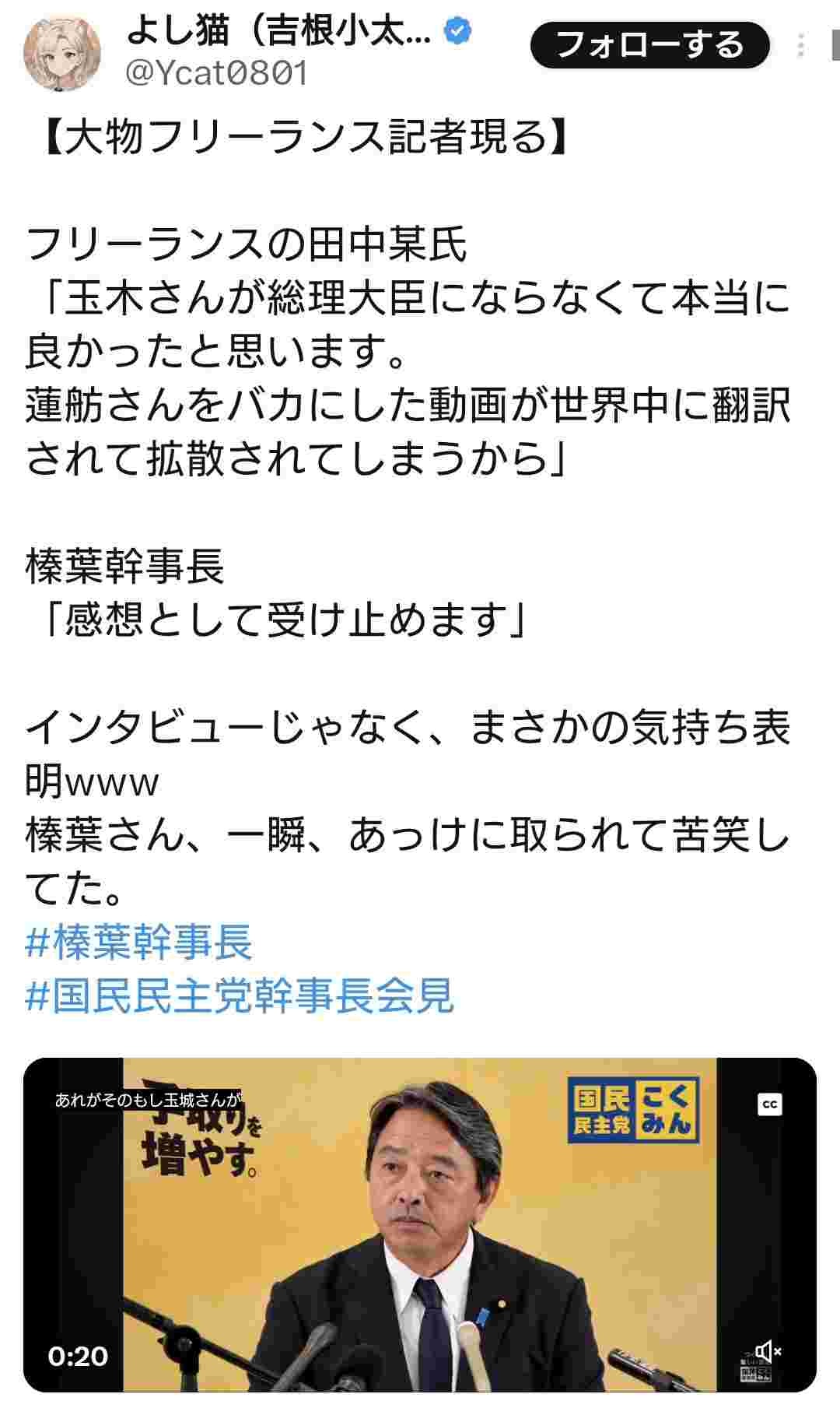 「玉木さんが総理大臣にならなくて本当に良かったと思います」 →榛葉氏「感想として受け止めます」