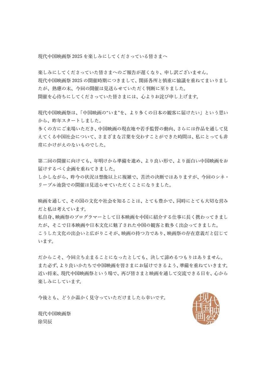 「現代中国映画祭2025」開催見送りのお知らせ 2025年…池袋