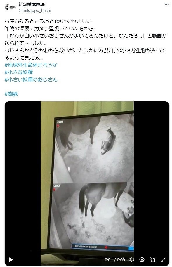 「白い小さいおじさんが歩いている」競走馬生産牧場が投稿した謎の物体映像に「エッホエッホですか?」「オーブも飛んで貴重な映像」と盛り上がる