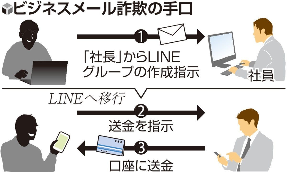 社長から届いたメールは詐欺だった――。企業の役員になりすまして社員にメールを送り、LINEグループなどに誘導し金を振り込ませる「ビジネスメール詐欺」の相談が昨年12月以降、全国で相次いでいる。業務命令を装い送金させるため、被害が高額になる恐れがあり、警察などが注意を呼びかけている。