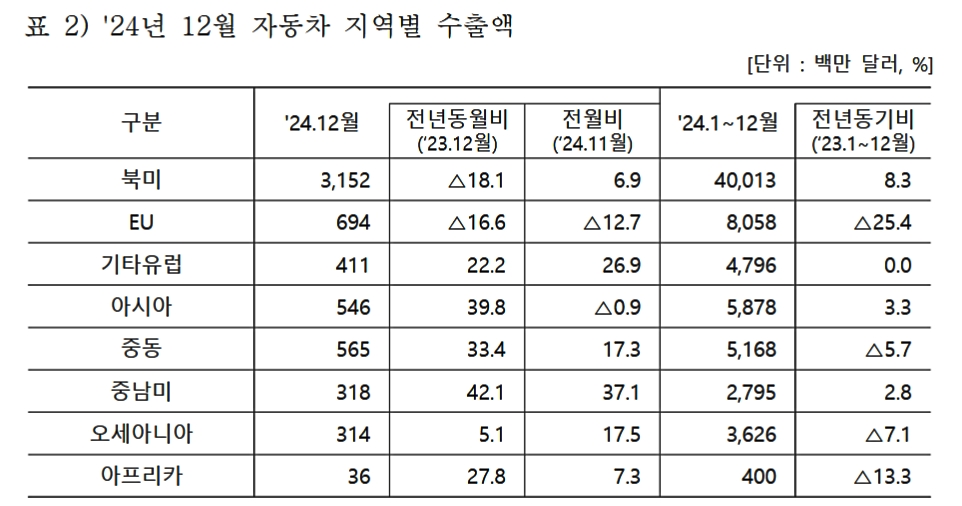2024年01~12月累計で韓国のEU向け自動車輸出は「80億5,800万ドル」で対前年比で「25.4%」も減少しています。EU以外の「その他欧州」は「±0.0%」で変化なしです。