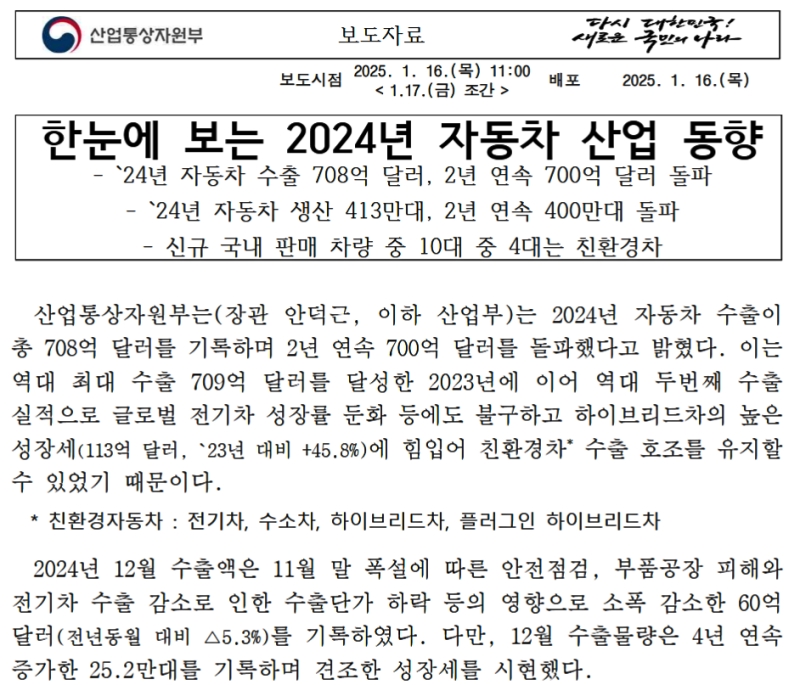 実際、韓国の産業通商資源部が「2024年の自動車産業動向について」という総括を2025年01月16日に出しています。以下がその資料ですが、総括部分を和訳してみます。