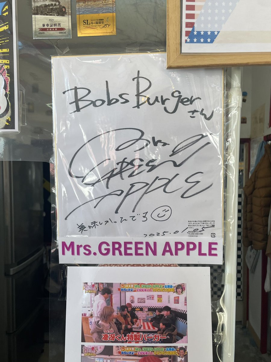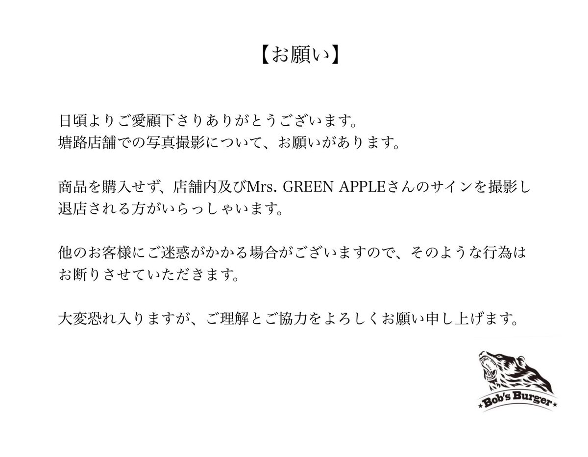 Bob's Burgerは2月28日、Xで「Bob's Burgerよりお願いがあります。 何卒よろしくお願い申し上げます。」と綴り、塘路店でのお願いを掲載。「商品を購入せず、店舗内及びMrs. GREEN APPLEさんのサインを撮影し退店される方がいらっしゃいます」とし、「他のお客様にご迷惑がかかる場合がございますので、そのような行為はお断りさせていただきます」とまとめた。