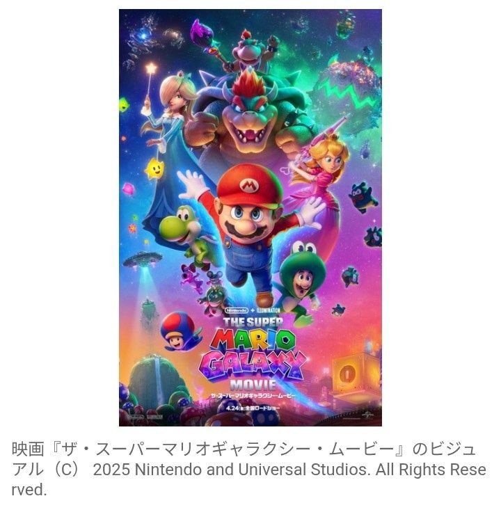 『ザ・スーパーマリオギャラクシー・ムービー』は、「スーパーマリオ」の世界をもとにしたアニメーション作品で、2023年に公開され、全世界累計興行収入約13億ドル(約2000億円)以上を記録した『ザ・スーパーマリオブラザーズ・ムービー』に続く2作目。