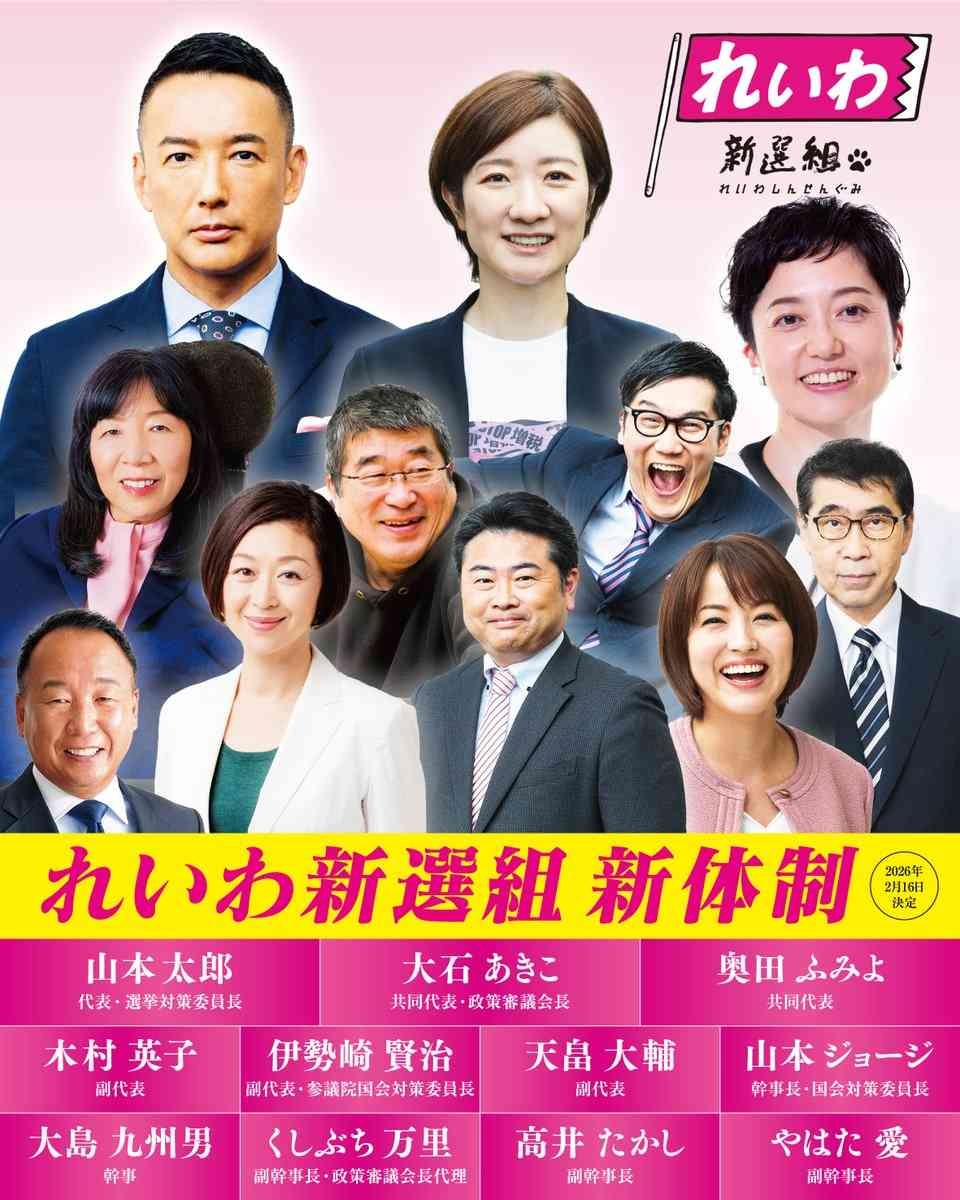 【高市解散】壊滅れいわ 落選した大石晃子氏が共同代表続投→批判や疑念に反発「私は無給でやります」事実でないことを言い連ねるのはいいかげんにして 「いざ地獄の釜に突入」と/デイリースポーツ online衆院選で大敗した、れいわ新選組が16日に「新体制」を発表。療養中の山本太郎氏が引き続き代表に就き、共同代表は続投となる大石晃子氏と、新たに奥田芙美代氏が務める。 選挙前8議席が壊滅。大勝した自民党の比例名簿が14人足りなくなる異例事態で、他...www.daily.co.jp※関連 (新体制 画像)
