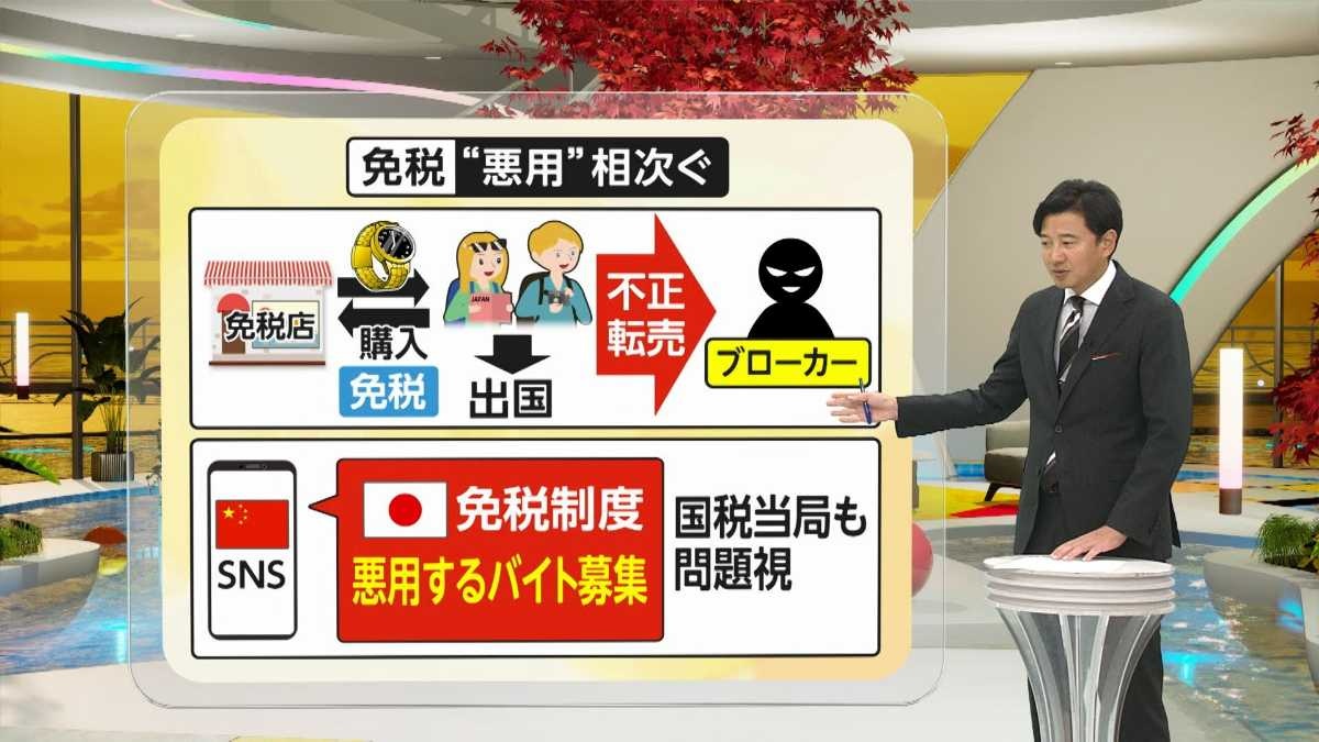 組織的に役割分担をして買ってくる人、それを人を介して転売するというルート。そこの中で巧妙化してきているのでなかなか取り締まりも難しい部分がある。例えば、日本を訪れた外国人観光客が免税で購入した時計を国内でブローカーに転売する方法や、実際に中国のSNSなどでは日本の免税制度を悪用するバイトの募集なんかも行われているということで、国税当局もこの辺りを問題視しているのが現状らしいです。