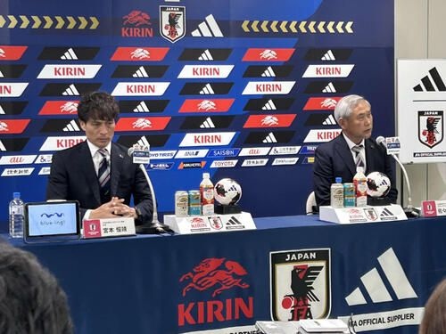 会見前、ただならぬ雰囲気が漂っていた。壇上のプレートは佐々木氏と並び「宮本恒靖会長」。2日前はロンドンで日本代表がイングランド代表から金星を挙げるところを見届けていた。それから34時間後の弾丸移動。当初の予定は4月の米国遠征メンバー発表だった。しかもニールセン監督の名前はなく宮本会長なのだから、何があったのか? メディアはざわついた。