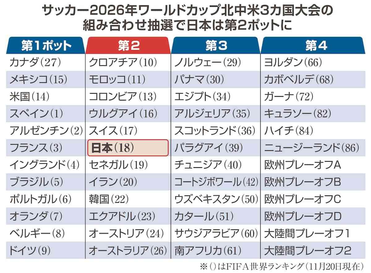 開催国シード(メキシコ、カナダ、米国)以外は、国際サッカー連盟(FIFA)世界ランキング順に4段階に格付けするポット分け。同18位の日本は第2ポットに入った。同ポットのチームは同組にならない。