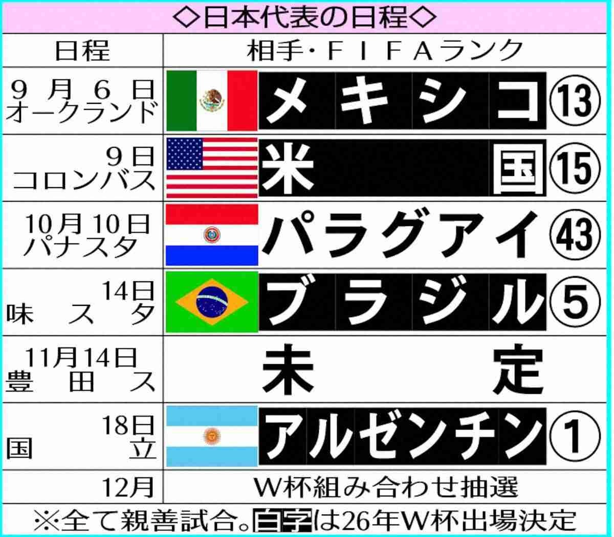 また、ブラジルとの強化試合は10月14日(味スタ)が有力となっていることも判明。当初は11月の国立開催が第1候補となっていたが、関係者によれば10月に来日する方向で調整が進められているという。FWビニシウス(Rマドリード)らを擁するスター軍団との対戦も絶好の腕試し。今秋はW杯予選が続いている欧州勢との対戦が困難な中、最善かつ最高のマッチメークが模索されている。