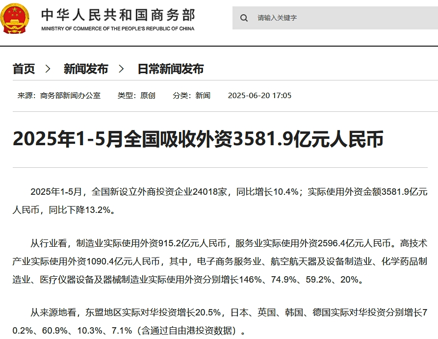 ⇒参照・引用元:『中国 商務部』公式サイト「2025年1-5月全国吸收外资3581.9亿元人民币」