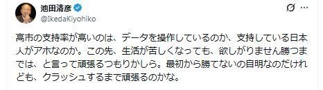 フジテレビ系「ホンマでっか!?TV」のコメンテーターとしても知られる生物学者で早稲田大学名誉教授の池田清彦氏が8日までにX(旧ツイッター)を更新。高市早苗首相の高市内閣の支持率が高い状況について、「データを操作しているのか、支持している日本人がアホなのか」と、疑問を呈した。https://news.yahoo.co.jp/articles/0674b9b5b95a5ac481d71b32b52ac9ea989ffcc6