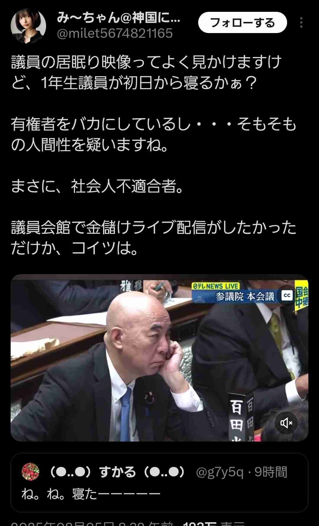 議員の居眠り映像ってよく見かけますけど、1年生議員が初日から寝るかぁ?有権者をバカにしているし・・・そもそもの人間性を疑いますね。まさに、社会人不適合者。議員会館で金儲けライブ配信がしたかっただけか、コイツは。