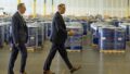 新工場建設協定の調印式が4日、県庁であり、マツダの毛籠勝弘社長兼CEOと村岡嗣政知事、岩国市の福田良彦市長が協定書に署名し、握手を交わした。