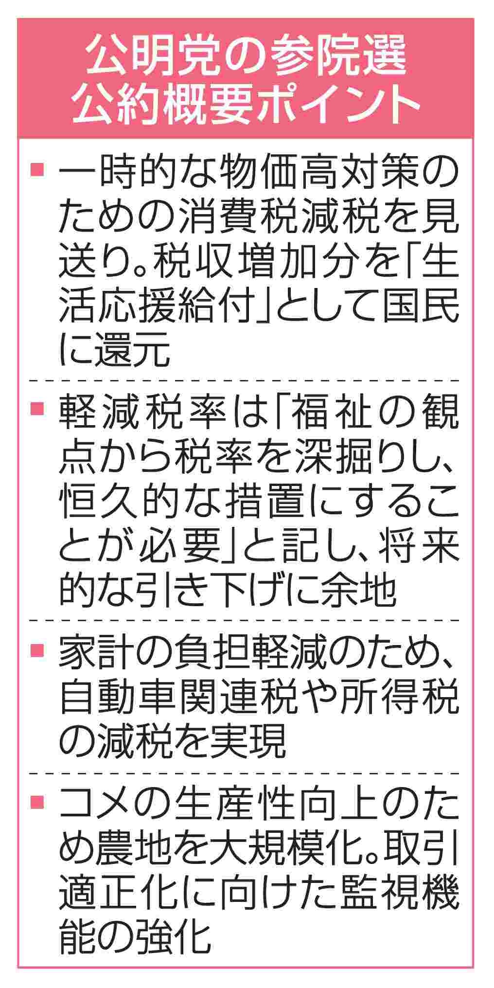 公明党の参院選公約第2弾の概要が判明した。当面の物価高対策として当初検討した、食料品などに適用される消費税の軽減税率引き下げは見送る一方、税収増加分を国民に還元する「生活応援給付」を盛り込む。関係者が5日明らかにした。