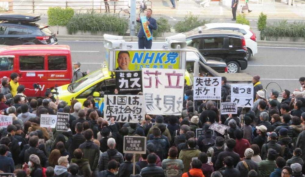 「帰れ!帰れ!」コールもこだましたが、立花氏は「イヤです」「おばちゃんこそ、おうち帰ったら?」などと呼応し、立ち止まった人からは「コントみたいやな」などと失笑ももれた。