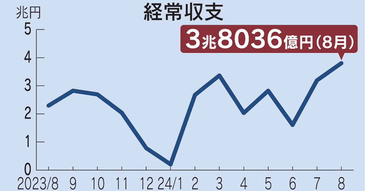 財務省が8日発表した8月の国際収支統計(速報)によると、モノやサービスなど海外との取引状況を示す経常収支は3兆8036億円の黒字だった。