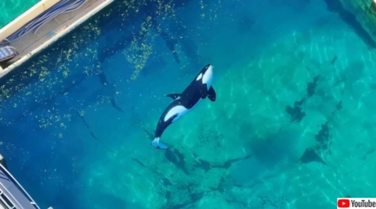 そして閉園から4か月。5月7日に撮影されたという映像には、メインテナンスが行われなくなり、藻が繁殖した濁ったプールで泳ぐシャチやイルカたちの姿がとらえられている。