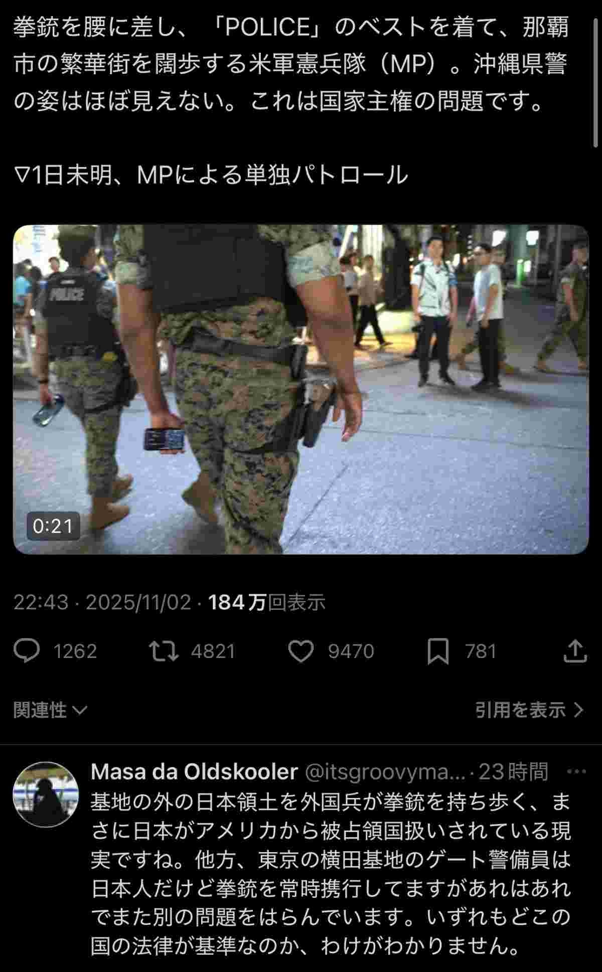 沖縄市では米兵同士の殴り合いがあり、男性2人を拘束した。IDカードの提示を拒否し、虚偽の申請をしたとして、別の海兵隊員と米軍関係者の男性2人がMPによって逮捕された。 - 34 : 2025/11/04(火) 12:38:14.01 ID:7bsmAYyu0