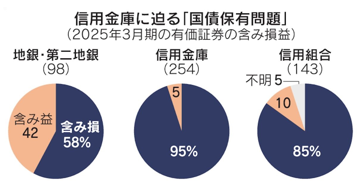 金利上昇で一部の信用金庫の財務が悪化している。日本経済新聞の集計によると、全国の信金が保有する有価証券の含み損は2025年3月期決算で2.5兆円弱に上った。前年同期から3倍超に膨らんだ。金融庁は年度内にも信金の財務の集中点検に乗り出す。