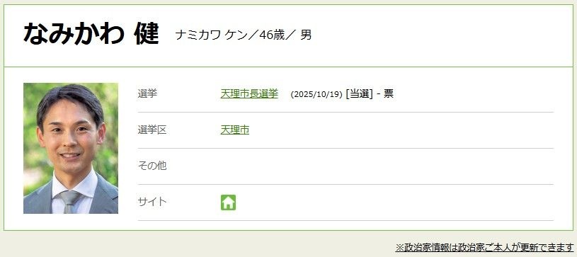 https://news.yahoo.co.jp/articles/96b3a96686ae9be1fd70c4dedbf14cd8a388aecf天理市長選が12日に告示された。無所属現職の並河健氏(46)のほかに立候補の届け出はなく、前回、前々回に続き、無投票で4選を果たした。