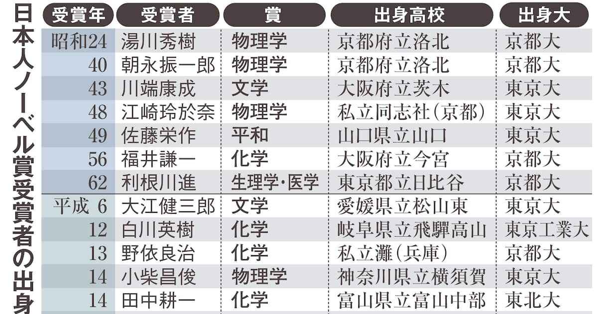 【学歴】日本人ノーベル賞受賞者の出身校一覧 東大を抜いて京大がトップに 高校は地方公立が優勢