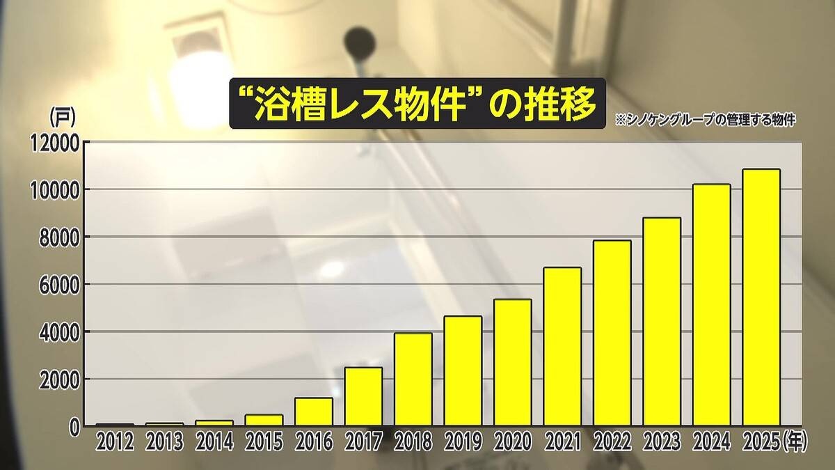 こちらの不動産会社では2012年から”浴槽レス物件”を扱い始め、その数は右肩上がり。
