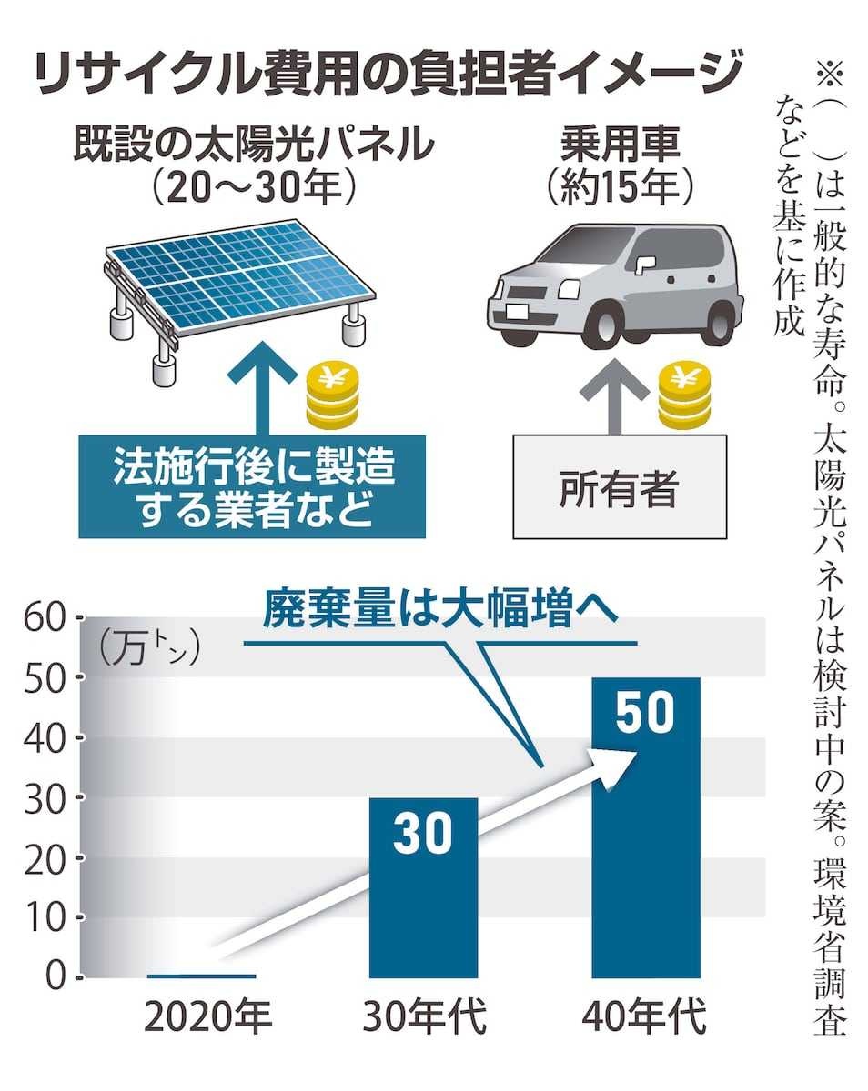 今国会での提出が見送られた法案はパネルの解体費用を所有者、リサイクル費用をメーカーに負担させる仕組みで、既設のパネルについては、法施行後に新たにパネルを製造するメーカーなどに負担させる内容だった。
