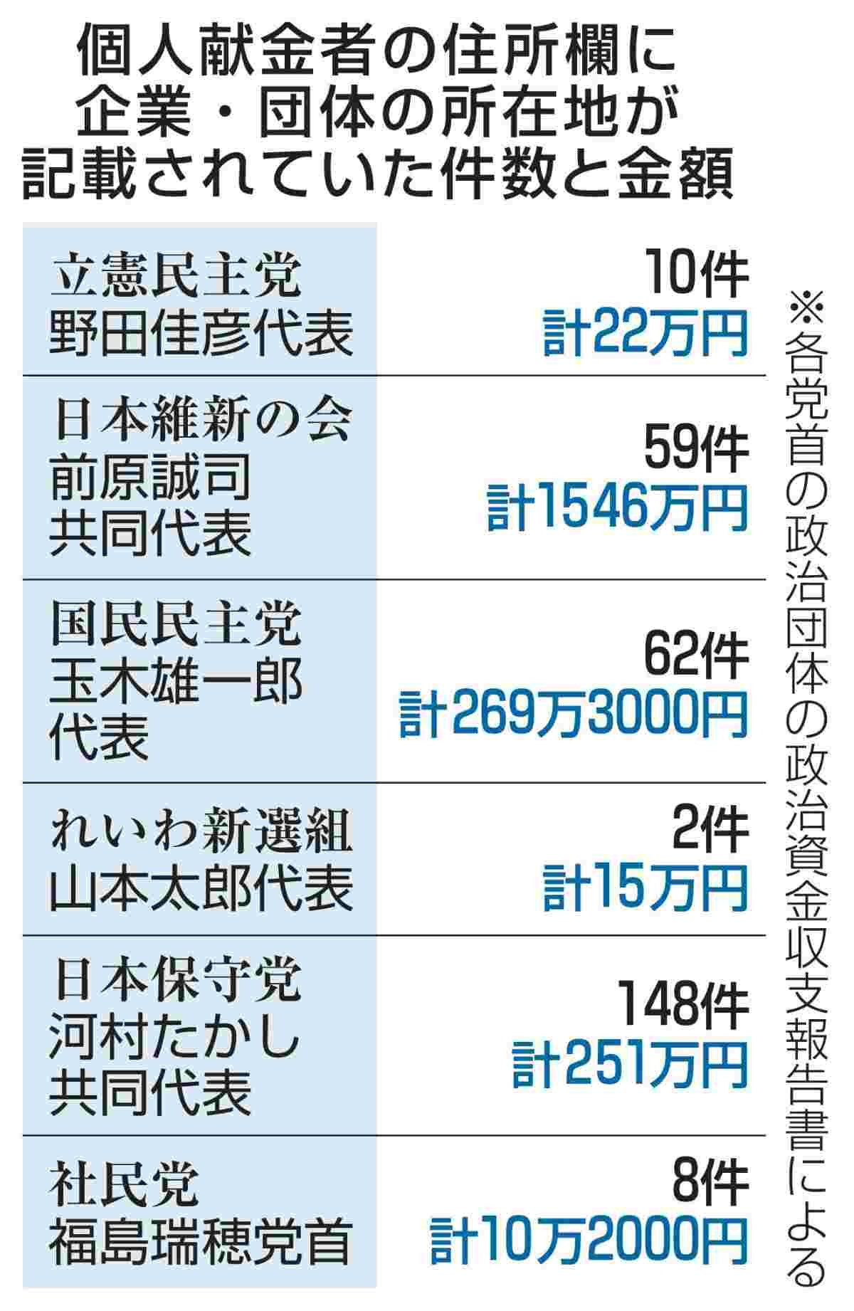 政治団体の政治資金収支報告書で実態と異なる個人献金者の住所表記が相次いで見つかった問題で、国民民主党の玉木雄一郎氏ら野党の代表や共同代表計6人の政治団体が2021~23年に受けた個人献金のうち289件総額2113万5千円分について、収支報告書の寄付者の住所欄にその人物が代表や役員を務める企業・団体の所在地を記載していたことが6日、分かった。最多額は日本維新の会の前原誠司共同代表の1546万円分だった。