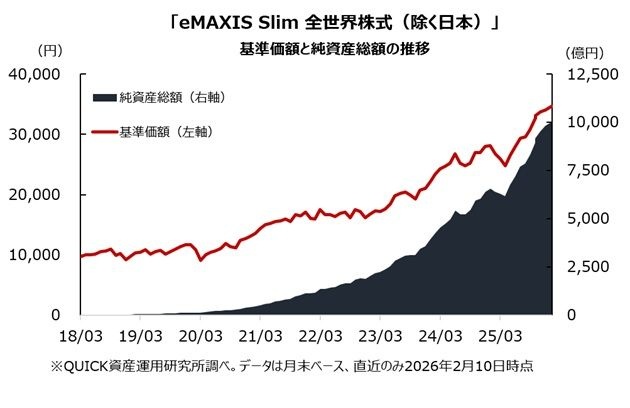 三菱UFJアセットマネジメントが運用する「eMAXIS Slim 全世界株式(除く日本)」の純資産総額(残高)が初めて1兆円を突破した。