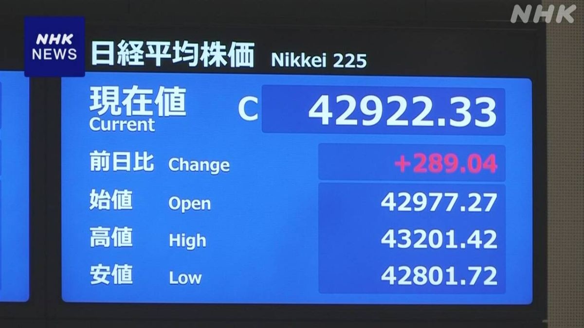 25日の東京株式市場は取り引き開始直後に半導体や自動車など輸出関連の銘柄に買い注文が広がり、日経平均株価は一時、500円以上値上がりして4万3000円台を回復しました。