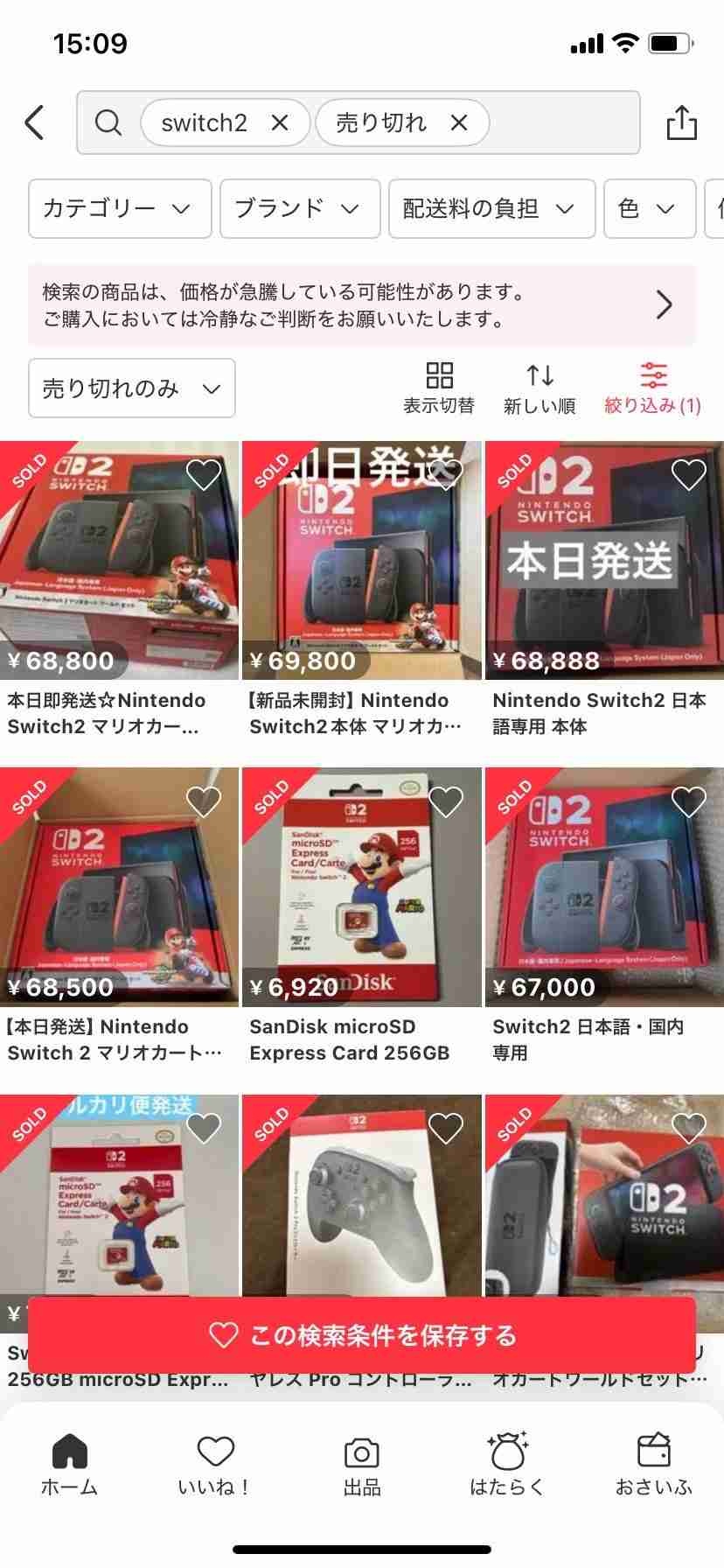 メルカリでは「Switch2」を検索すると、「検索の商品は、価格が急騰している可能性があります。ご購入においては冷静なご判断をお願いいたします」と注意喚起しているが、価格帯は通常価格4万9980円(日本語・国内専用)のところ6万9800円~7万3000円台で出品されている。