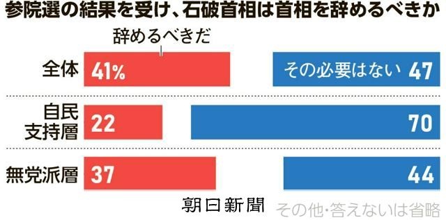 朝日新聞社が7月26、27の両日に実施した全国世論調査(電話)で、参院選の結果を受けて石破茂首相が辞めるべきか尋ねたところ、「辞めるべきだ」が41%で、「その必要はない」の方が47%とやや多い結果になった。