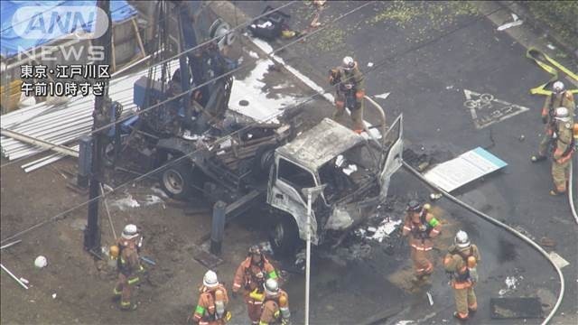 東京・江戸川区の工事現場でトラックが燃える火事があり、8人がけがをしました。